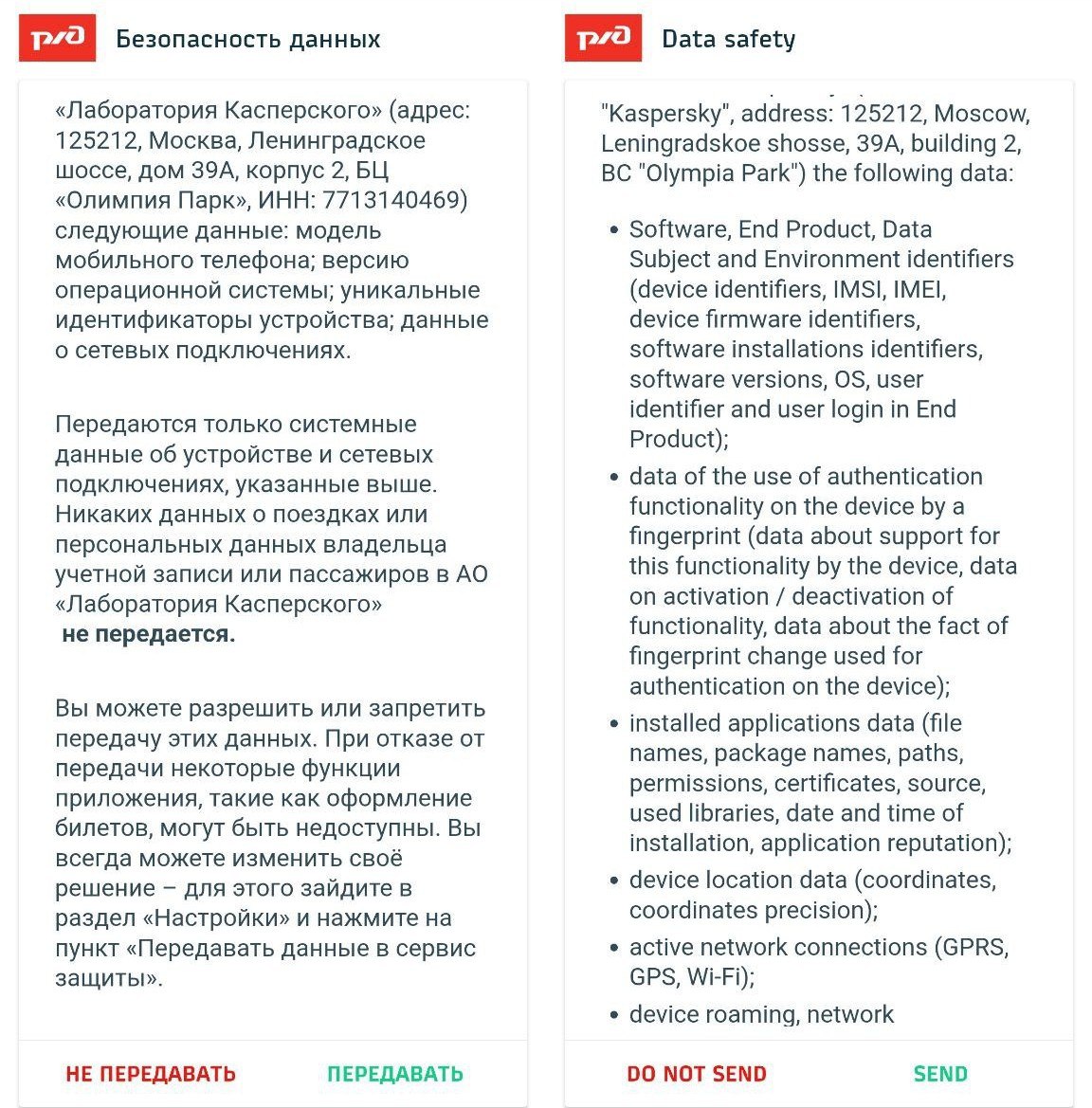 Но в обеих версиях есть кнопка «не передавать данные», и она работает — я проверил. То есть отказ от передачи данных не лишает человека возможности купить билет на поезд. Достаточно указать минимальный набор данных, который нужен компании для того, чтобы продать билеты: ФИО и номер документа. Так что это пока еще не такое уж шпионство.