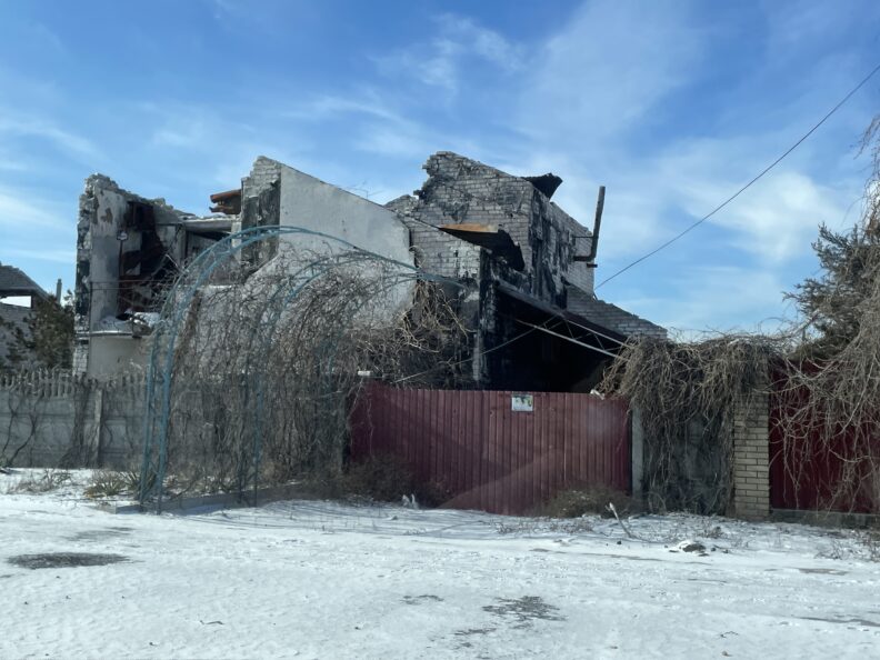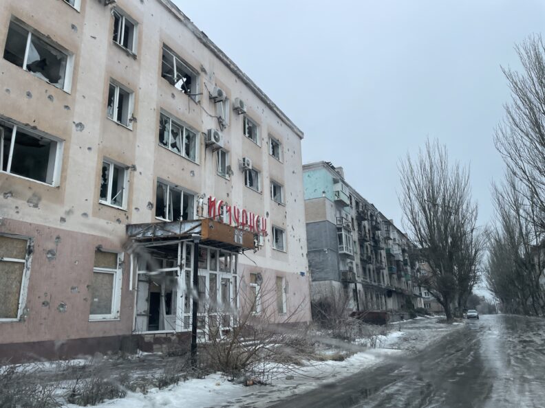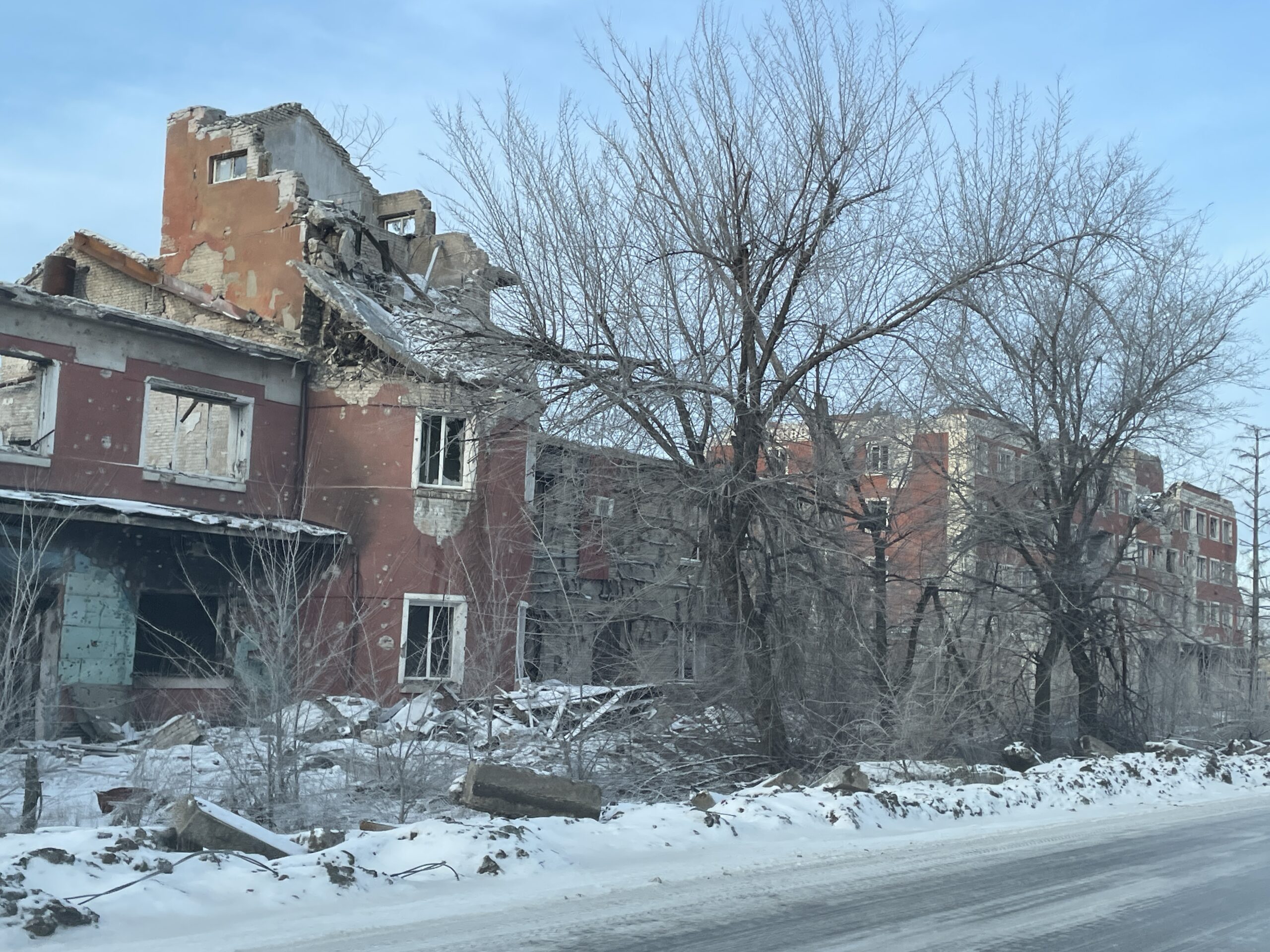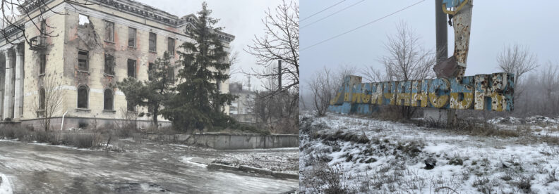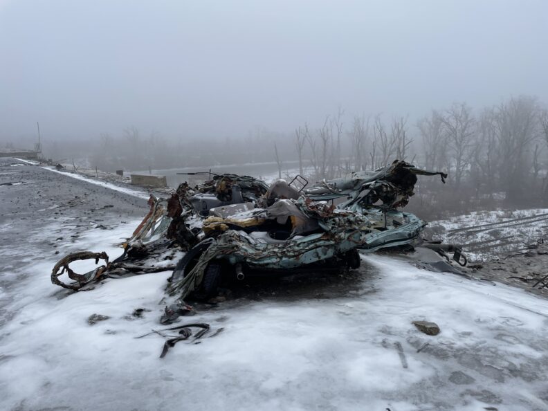 Пока мы выезжаем из Рубежного, видим гору из смятых и сгоревших машин, промышленные и сельскохозяйственные постройки — все в дырах от снарядов. Затем площадь с круговым движением, с двух сторон перекрытую блокпостами. Посередине зеленый островок со стелой «Заря» в честь местного научного химического предприятия. Вокруг островка бытовки, а над площадью натянута сетка от FPV-дронов, в ней лежит запутавшаяся черная птица. На окраине, там где был частный сектор, — все уничтожено, лунный серый пейзаж.