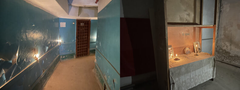 Бомбоубежище — это длинный угловатый коридор с той же синей облупившейся краской и темно-коричневыми дверями по бокам. К стене прибиты доски, на них стоят свечи. Это единственный источник света в здании. На одной из коричневых дверей поверх трафаретной надписи «склад» мелом написано «Церковь» и «Храм», между двух крестов висит икона. В центре комнаты шкаф, на полках которого стоят иконы, над ними — трафаретная надпись «Не кури». У этой надписи проходили церковные службы под бомбежками.