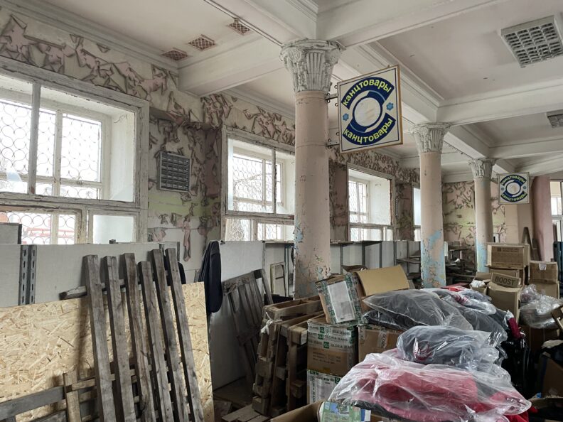 За входом на склад все серое и грязное: серая шахта, серые ступени, стены тоже серые — грунтовка выступает из-под блеклой синей краски. Два пролета вниз и подвал. Бросается в глаза плакат о пожарной безопасности на украинском языке. Его пытались сорвать, но приклеен он намертво.